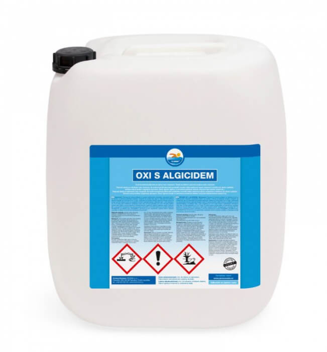 Přípravek vhodný pro ošetřování vody v bazénech. Na rozdíl od použití chlorových prostředků nevzniká žádný nepříjemný zápach, nedochází k dráždění očí, sliznic a pokožky, ošetřená voda je kvalitní a hygienicky nezávadná. Obsah algicidu zajišťuje za normálních podmínek odolnost vody proti všem druhům vodních řas. Dávkování: Přípravek je vhodné přidávat do bazénu dávkovacím čerpadlem napojeným přímo na nádobu, ve které je přípravek dodáván. Čerpadlo se nastaví tak, aby se udržovala koncentrace aktivního kyslíku ve vodě mezi 8 až 15 mg/l. Dávkování se provádí vždy při zapnuté cirkulaci vody. Při prvním použití, pokud možno po vyčištění a novém naplnění bazénu, dávkujte max. 1,0 litr prostředku na 10 m3 vody, pak v týdenních odstupech vždy max. 0,5 litru prostředku na 10 m3 . Při velmi teplém počasí nebo silném provozu bazénu je vhodné časové rozpětí při stejných dávkách zkrátit. Hodnotu pH v rozmezí 6,8 – 7,6, která je pro provoz bazénu optimální, je vhodné udržovat za použití přípravku PROXIM pH MINUS resp. PROXIM pH PLUS pomocí regulačního zařízení, které v případě odchylky od ideální hodnoty automaticky provede korekci. Nebezpečí. Zdraví škodlivý při požití. Zdraví škodlivý při vdechování. Způsobuje vážné poškození očí. Dráždí kůži. Může způsobit podráždění dýchacích cest. Toxický pro vodní organismy, s dlouhodobými účinky.Uchovávejte mimo dosah dětí. Proveďte preventivní opatření proti smíchání s hořlavými materiály. PŘI ZASAŽENÍ OČÍ: Několik minut opatrně vyplachujte vodou. Vyjměte kontaktní čočky, jsou-li nasazeny a pokud je lze vyjmout snadno. Pokračujte ve vyplachování. PŘI STYKU S KŮŽÍ: Omyjte velkým množstvím vody a mýdla. Necítíte-li se dobře, vyhledejte lékařskou pomoc/ošetření. Používejte požadované osobní ochranné prostředky.