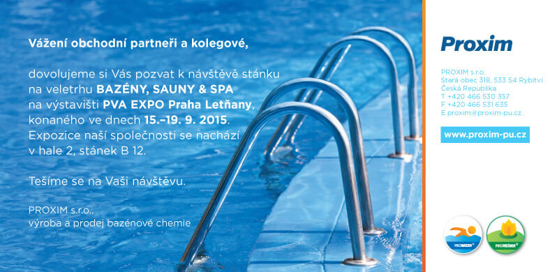 dovolujeme si Vás pozvat k návštěvě stánku na veletrhu BAZÉNY, SAUNY & SPA na výstavišti PVA EXPO Praha Letňany, konaného ve dnech 15.-19. 9. 2015. Expozice naší společnosti se nachází v hale 2, stánek B 12.